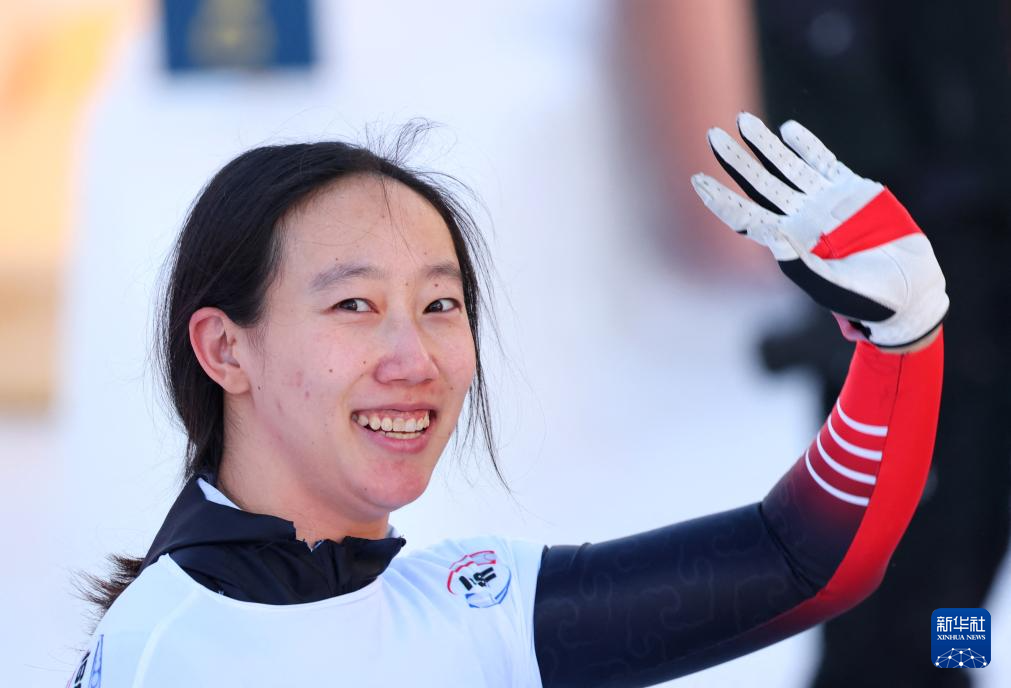 1月9日,中国选手赵丹在女子钢架雪车第二轮比赛后庆祝。