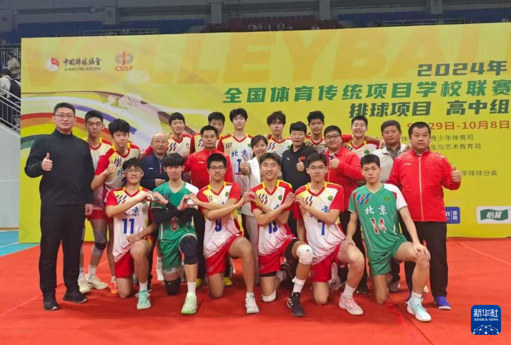 北京景山学校中学排球队高中组在2024年全国体育传统项目学校联赛夺冠后合影(2024年10月7日摄)。