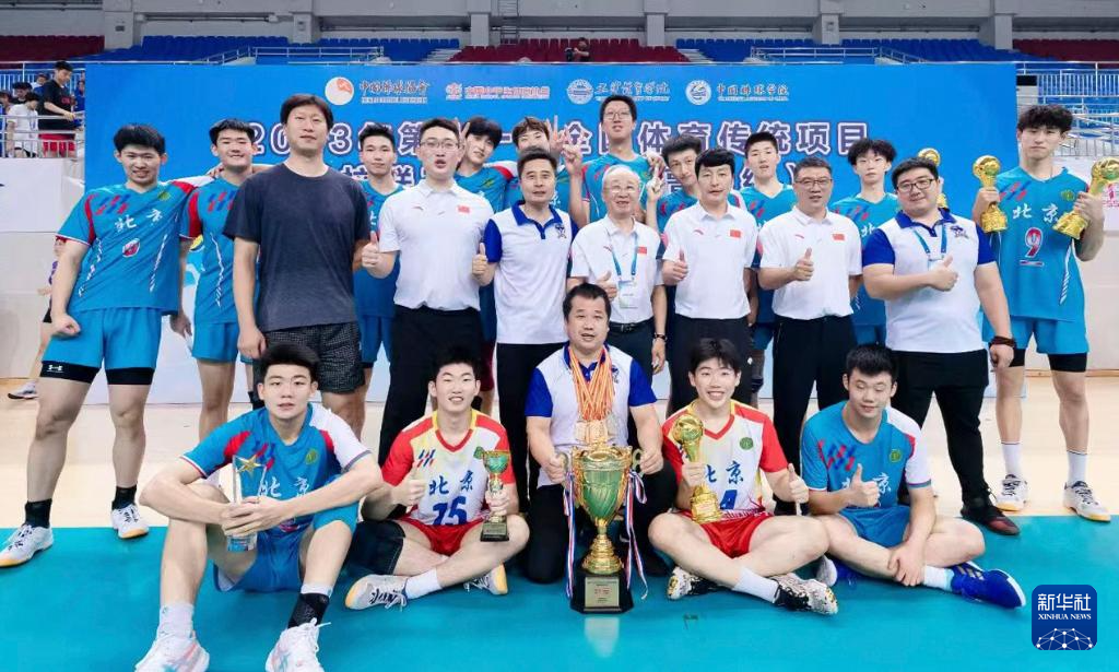 冠军北京景山学校排球队高中组在2023年全国体育传统项目学校联赛颁奖仪式后合影(2023年8月摄)。