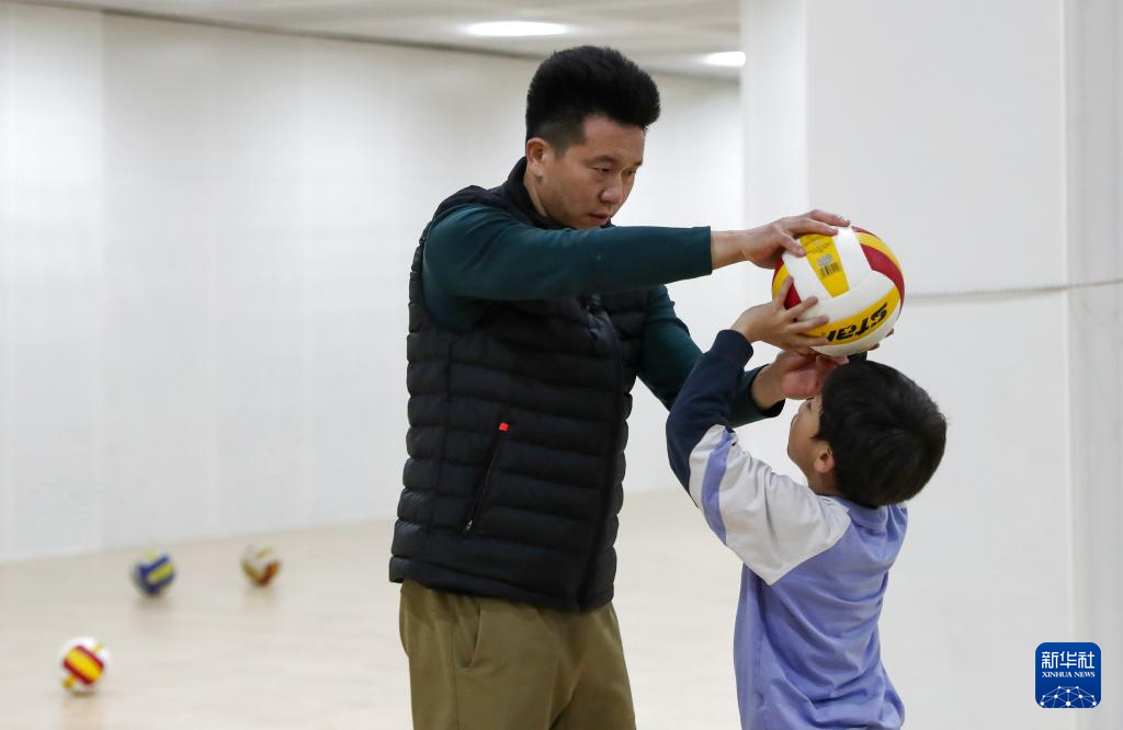1月8日,北京景山学校排球队小学组主教练尹晓光(左)在训练中指导球员。