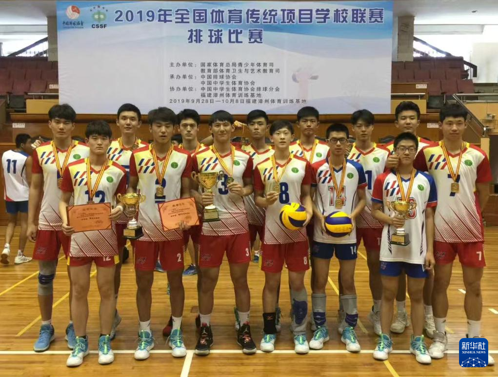 冠军北京景山学校排球队高中组在2019年全国体育传统项目学校联赛颁奖仪式后合影(2019年10月摄)。