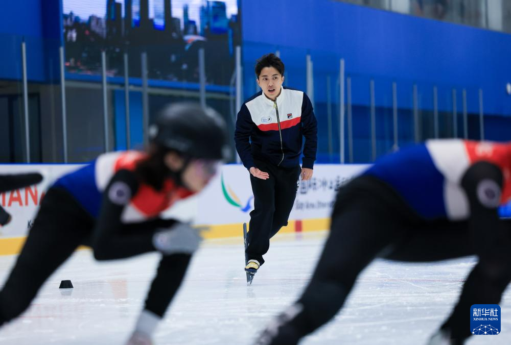 1月9日,中国香港短道速滑名将、香港速度滑冰学院执行董事朱定文(右一)带领小运动员训练。