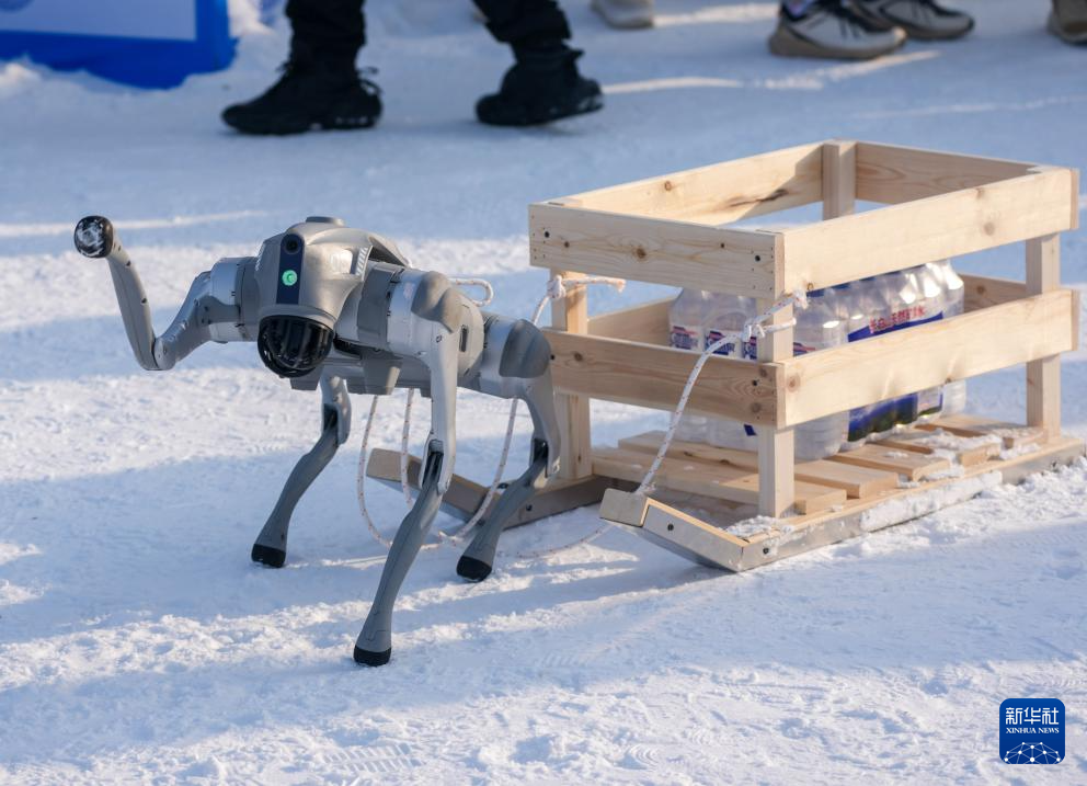 1月10日,多足仿生机器人在雪橇运输赛中。