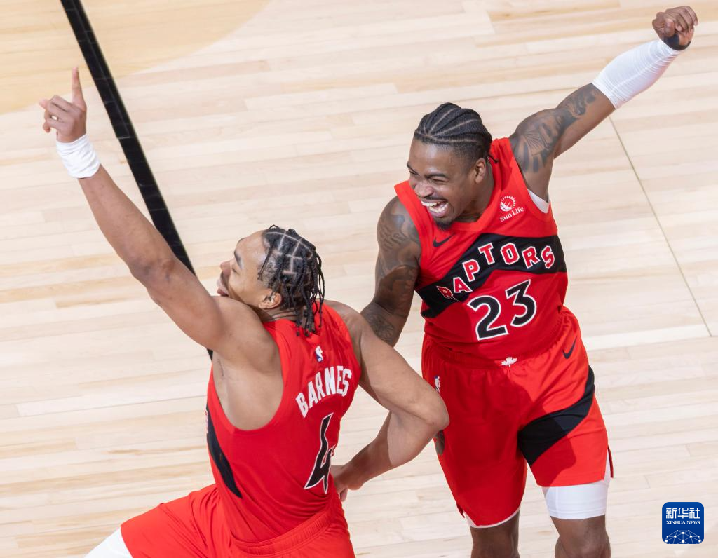 1月11日,猛龙队球员巴恩斯(左)与队友谢德在比赛后庆祝胜利。