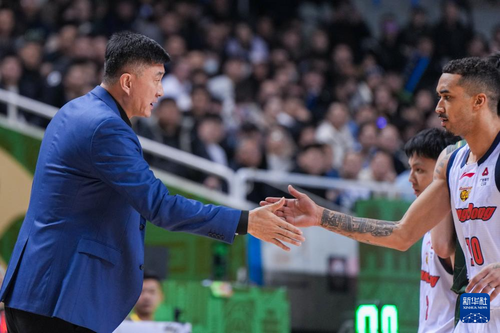 1月13日,广东东阳光队主教练杜锋(左)在场边与球员奎因击掌。