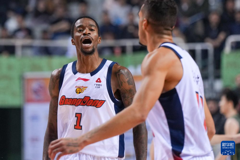 1月13日,广东东阳光队球员艾德蒙·萨姆纳(左)在比赛中庆祝得分。