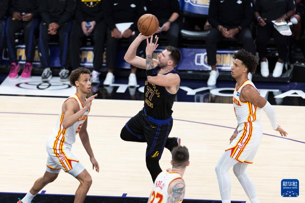 1月13日,湖人队球员卢卡·东契奇(上中)在比赛中投篮。