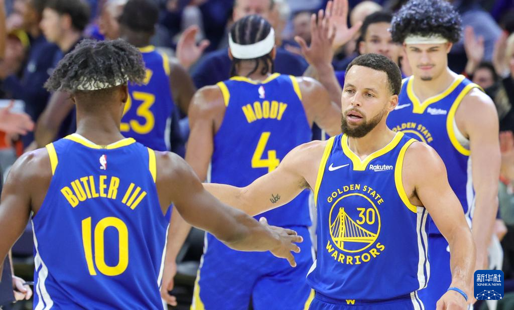 1月13日,勇士队球员库里(前右)在比赛中与队友巴特勒庆祝。