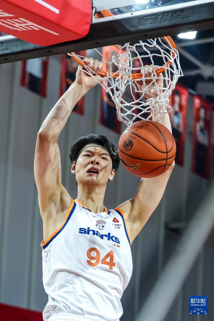 1月13日,上海久事队球员王哲林在比赛中扣篮。