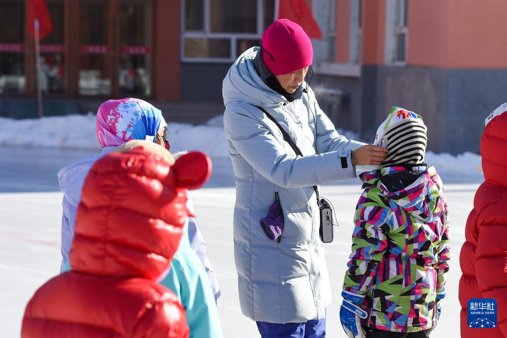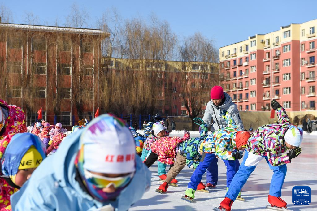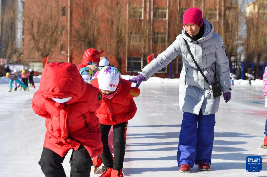 1月13日,在吉林省四平市六马路小学冰场上,齐兵指导学生们滑冰。