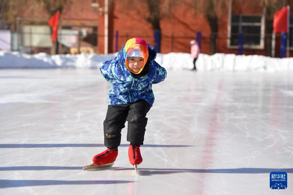 1月13日,在吉林省四平市六马路小学,学生们在冰场上滑行。