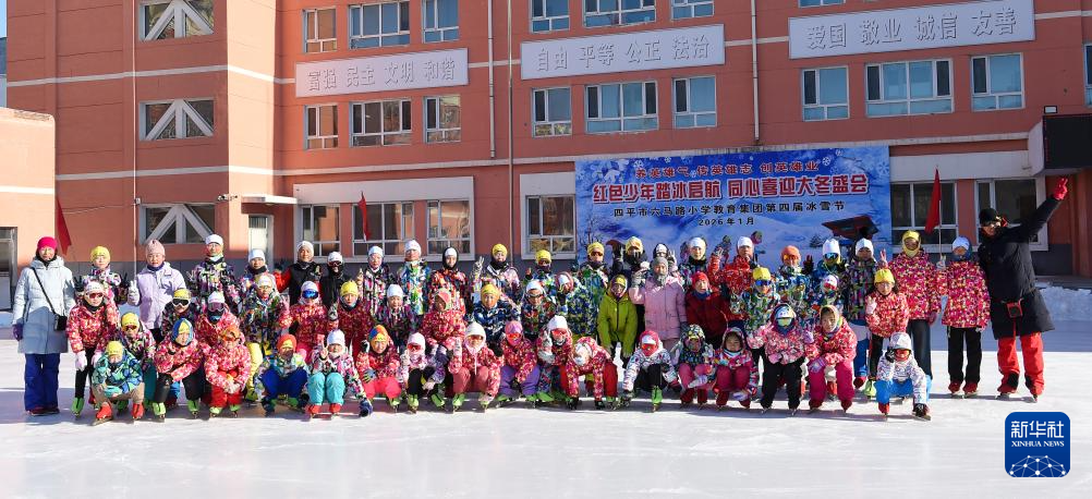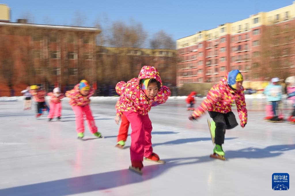 数九寒天,吉林省四平市六马路小学操场“变身”冰场,学校“红色骑兵”速滑队队员在冰场上飞驰,热闹非凡。