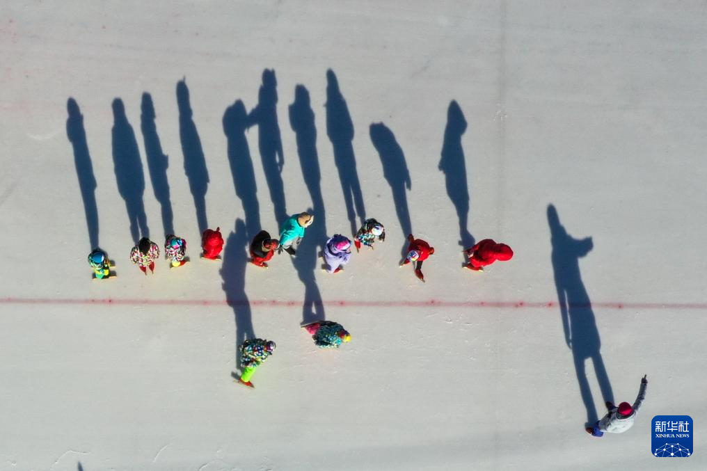 1月13日,在吉林省四平市六马路小学冰场上,齐兵(右一)指导学生们滑冰(无人机照片)。