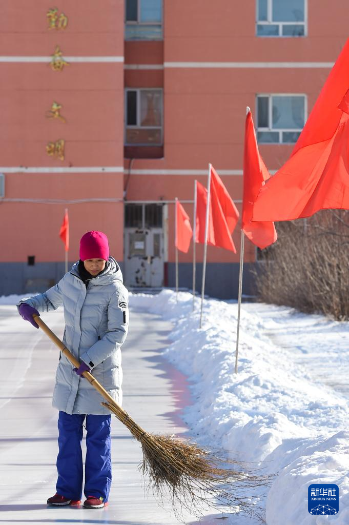 1月13日,在吉林省四平市六马路小学,齐兵在训练前打扫冰场。