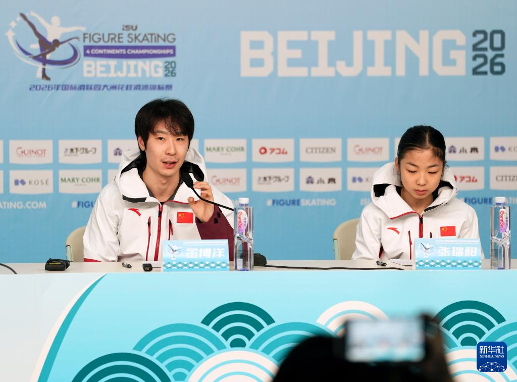 1月15日,中国花样滑冰运动员金博洋(左)、张瑞阳在发布会上。