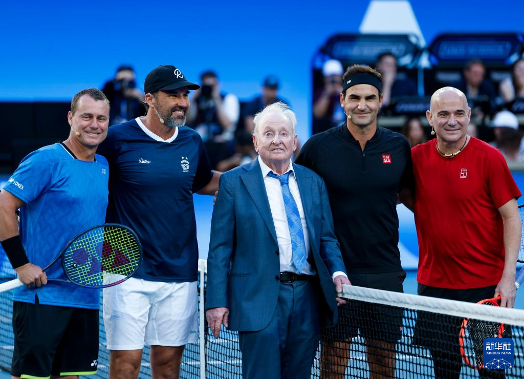 1月17日,休伊特、拉夫特、罗德·拉沃尔、费德勒、阿加西(从左到右)在表演赛前合影。