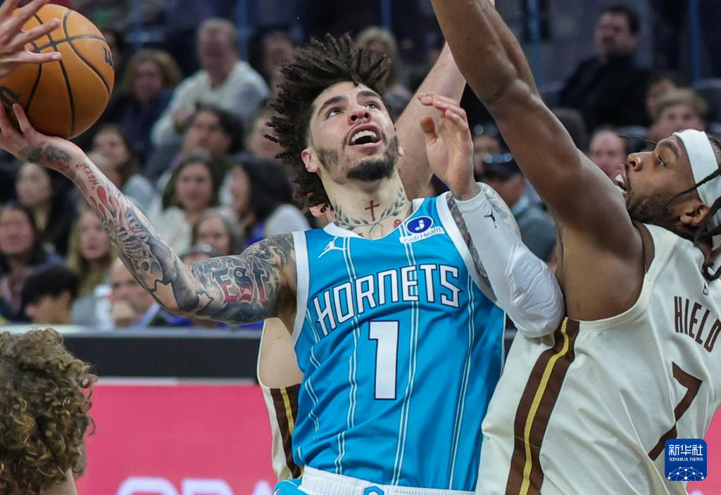 1月17日,黄蜂队球员拉梅洛·鲍尔(左)在比赛中突破上篮。