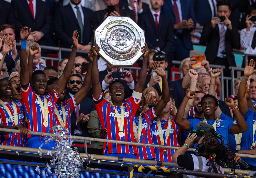 2025年8月10日,水晶宫队队长马克·格伊(中)在2025英格兰社区盾足球赛赛后捧起奖杯。新华社发