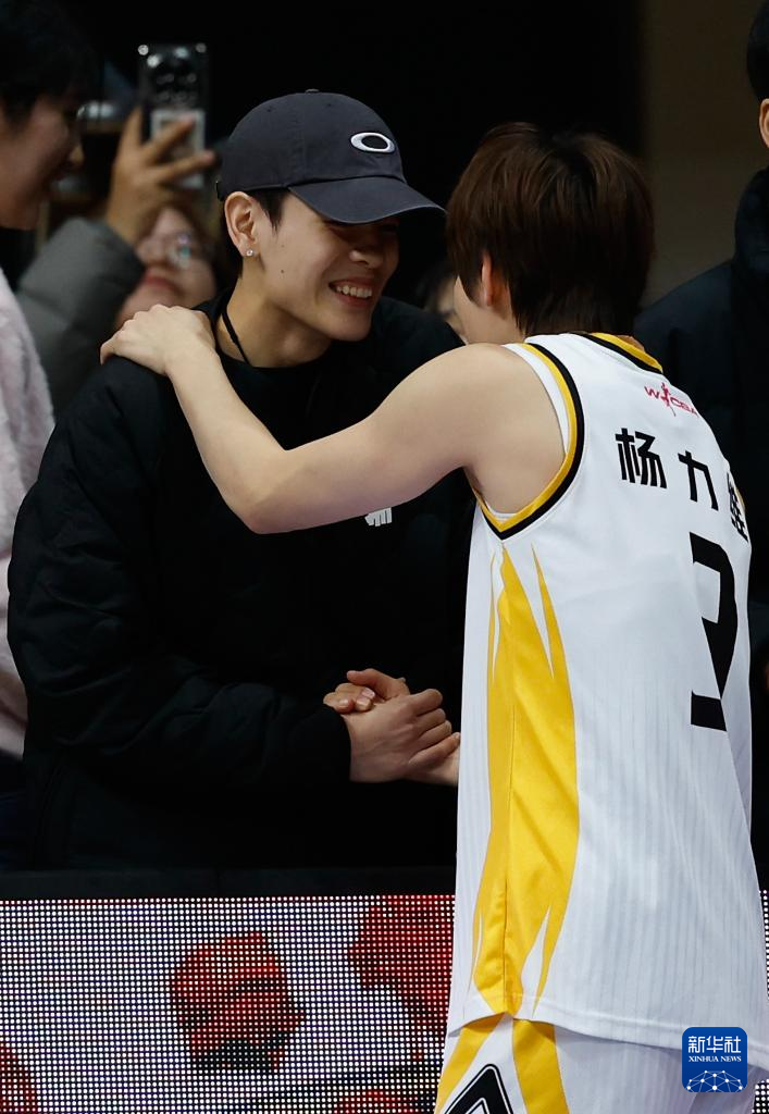 1月20日,参加女篮国家队集训的广东东莞新彤盛队球员杨舒予(右后)在开赛前与姐姐杨力维拥抱。