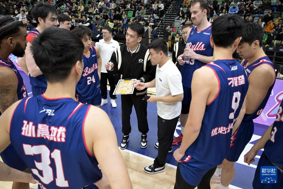 1月23日,香港金牛队主教练解立彬(中)在比赛间隙指导球员。