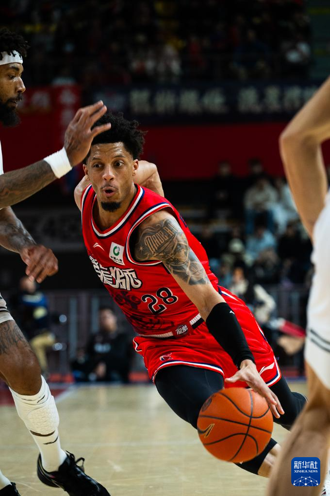 1月23日,广州朗肽海本队球员威金顿(中)在比赛中持球突破。