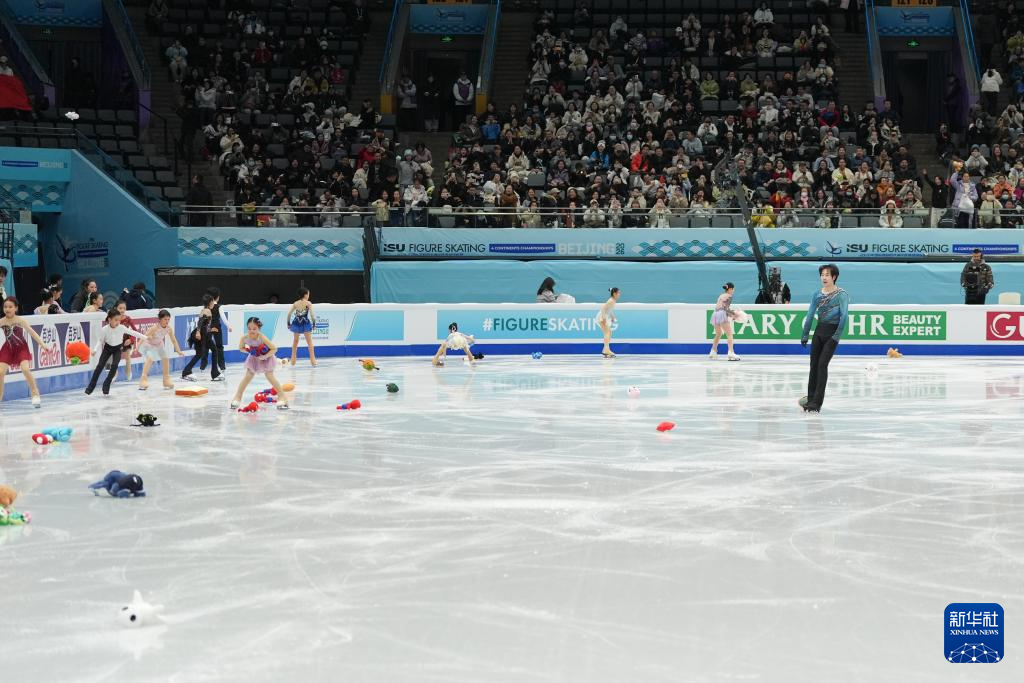 1月24日,场内观众在中国选手金博洋的男单短节目比赛结束后,向冰场内抛掷玩偶。