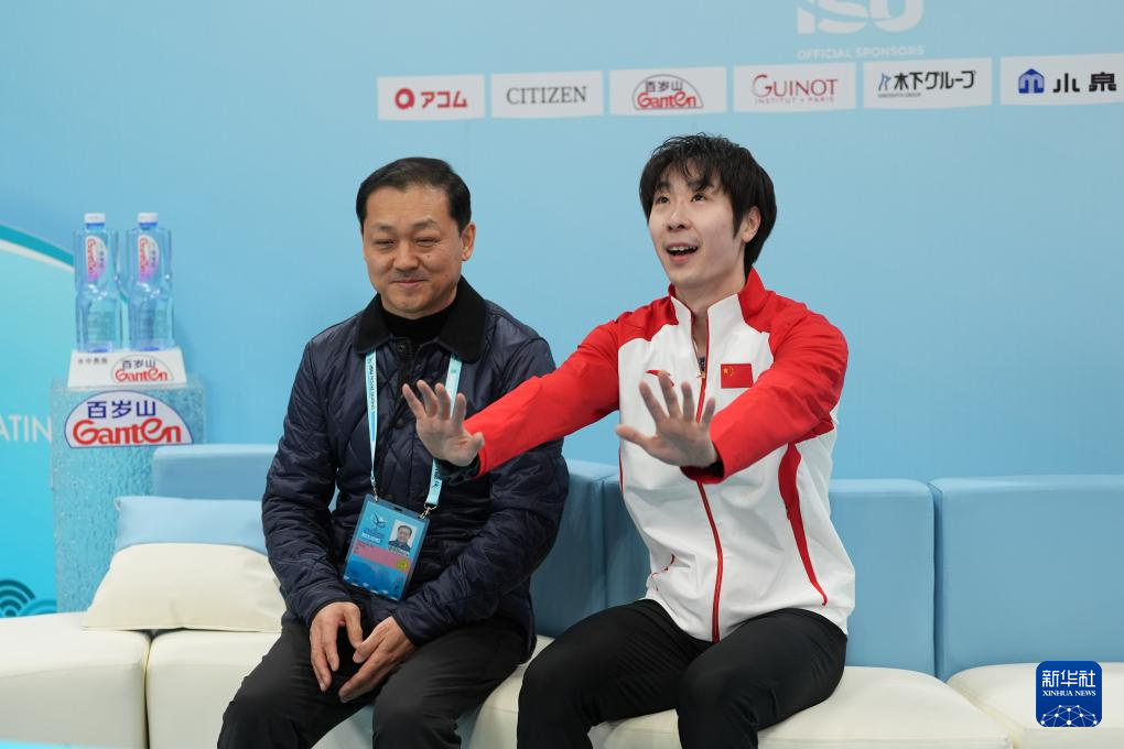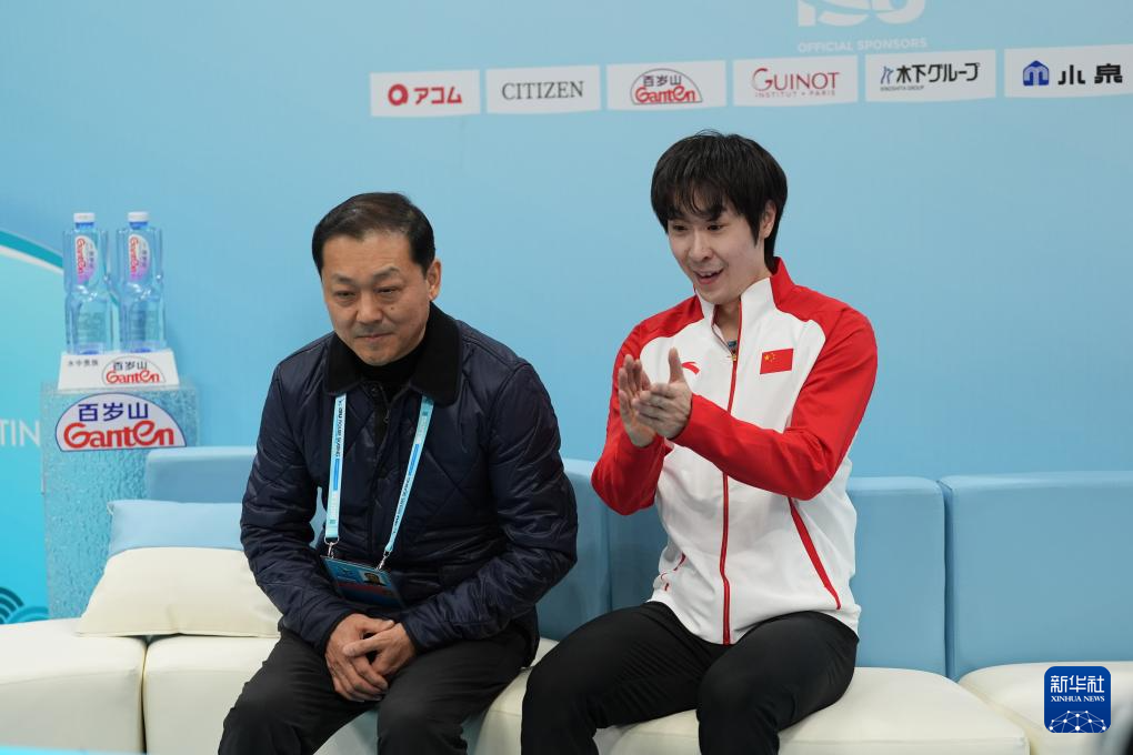 1月24日,中国选手金博洋(右)得知自己的分数后鼓掌。