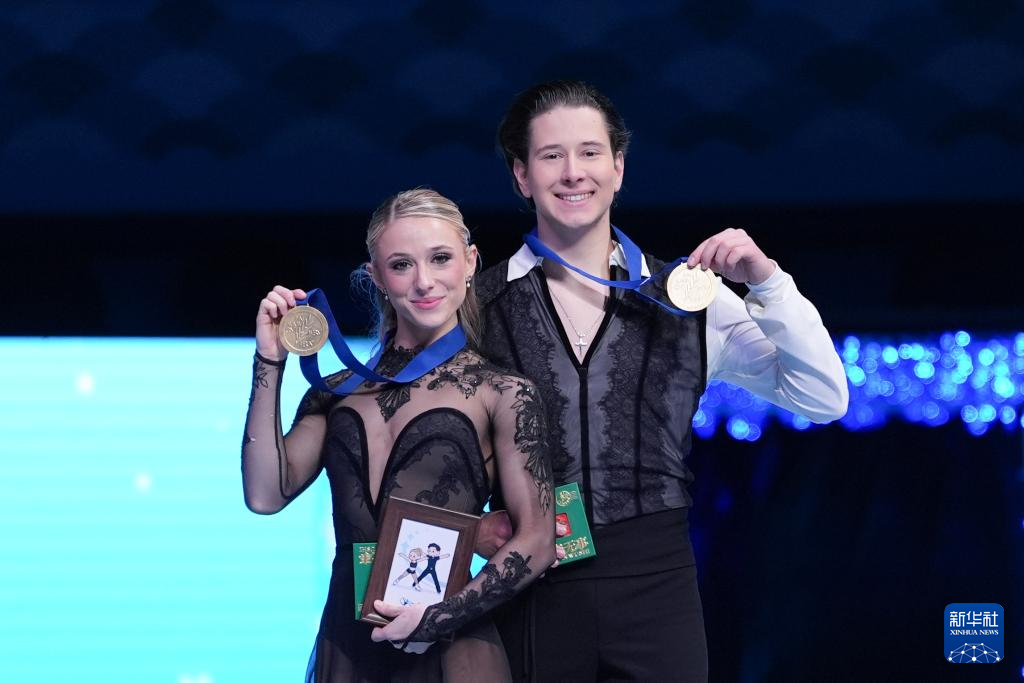 1月23日,美国组合埃米莉亚·津加斯(中)/瓦迪姆·科列斯尼克(右)得知自己获得冠军后庆祝。
