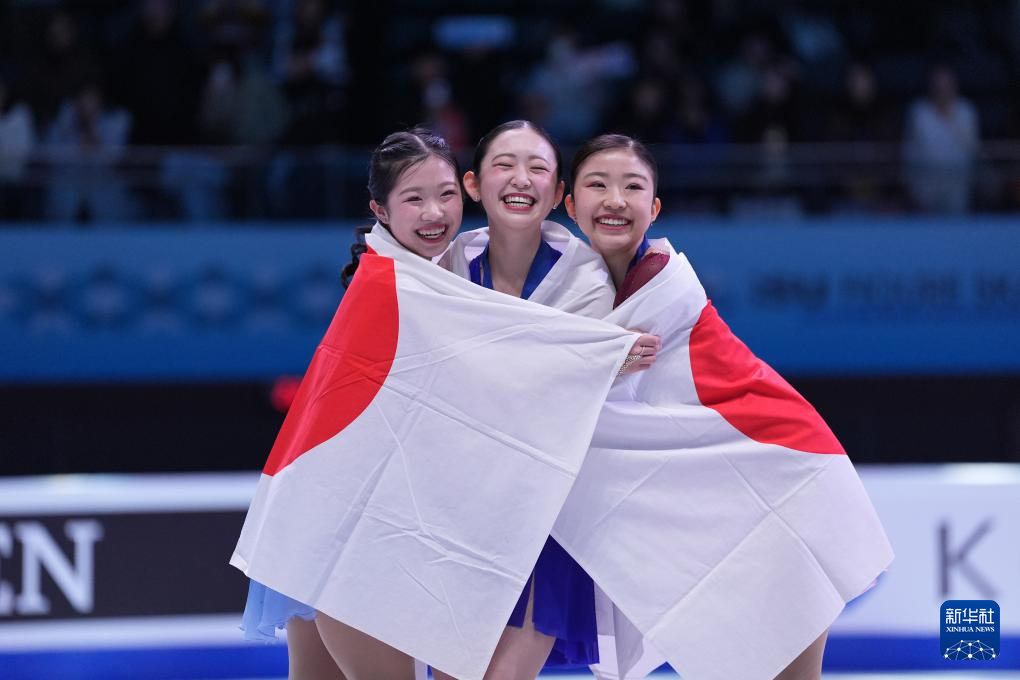 1月23日,女子单人滑冠军日本选手青木祐奈(中)、亚军日本选手中井亚美(左)与季军日本选手千叶百音在颁奖仪式上。