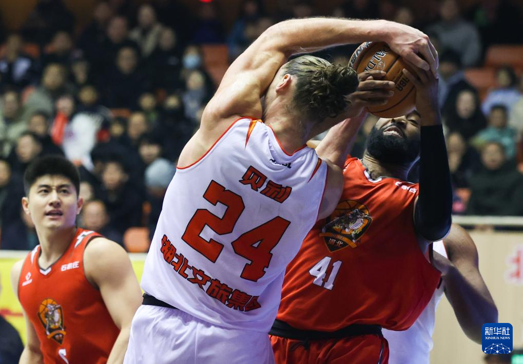 1月23日,湖北文旅队球员贝利·斯蒂尔(右)在比赛中对石家庄翔蓝队球员王炫造成犯规。