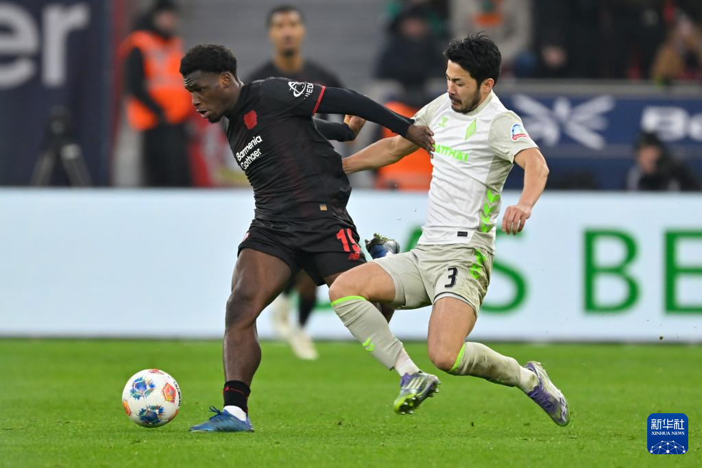 1月24日,勒沃库森队球员波库(左)和云达不来梅队球员菅原由势在比赛中拼抢。