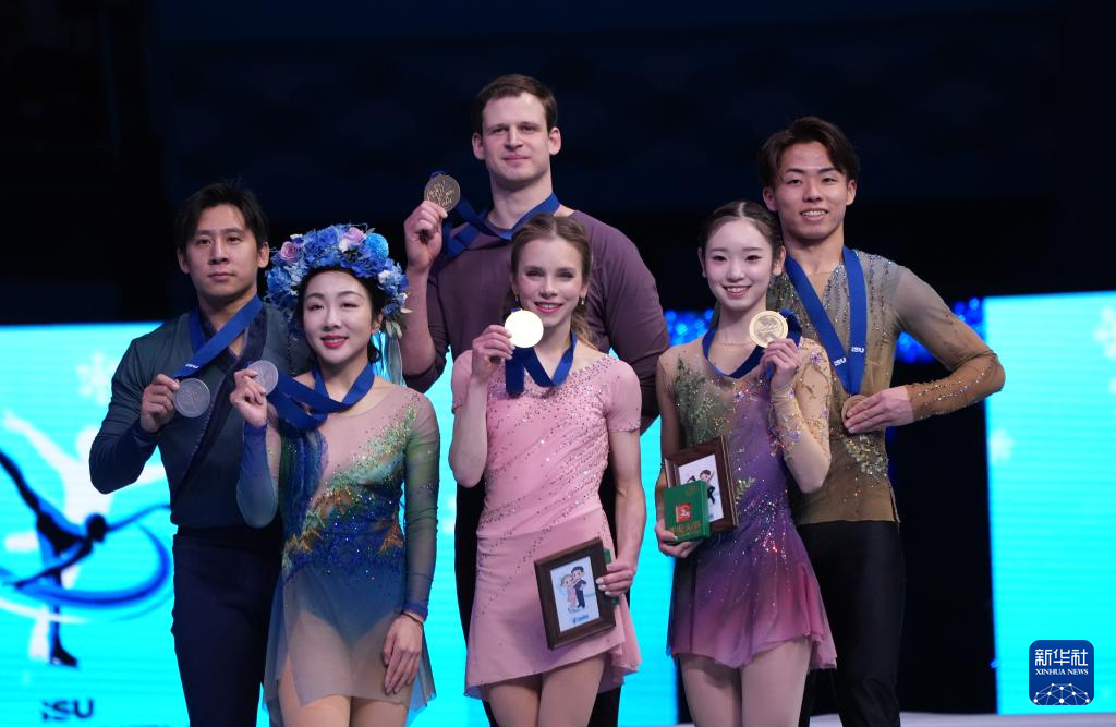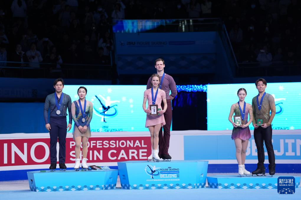 1月24日,冠军美国组合阿莉萨·埃菲莫娃(中前)/米沙·米特罗法诺夫(中后)、亚军中国组合隋文静(左二)/韩聪(左一)、季军日本组合长冈柚奈(右二)/森口澄士(右一)在颁奖仪式上。