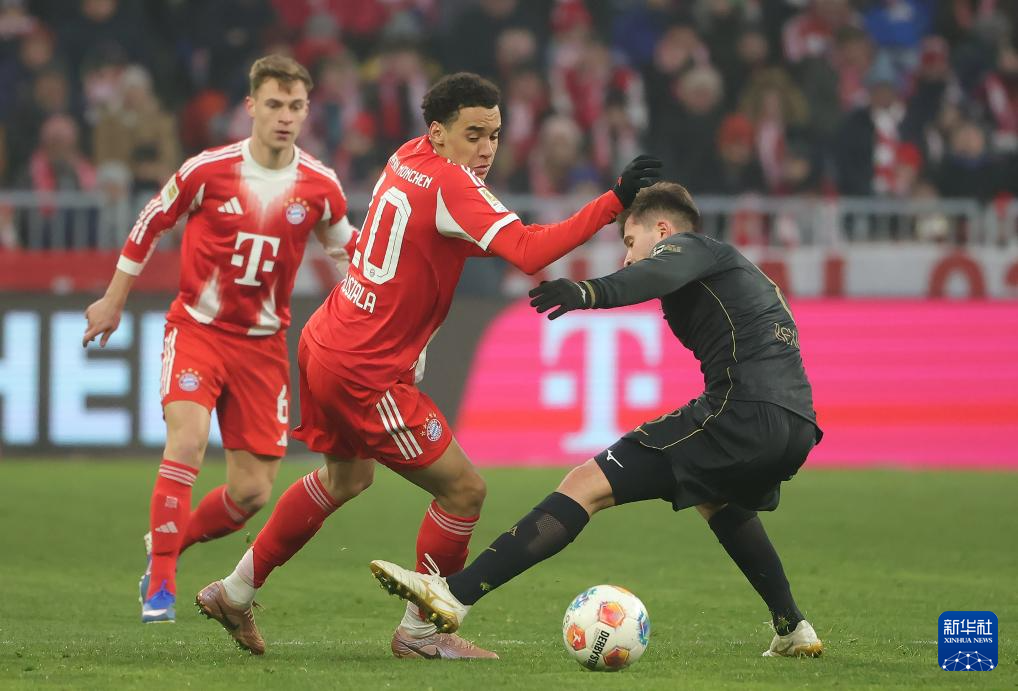 1月24日,拜仁慕尼黑队球员穆西亚拉(中)和奥格斯堡队球员雷治贝察伊(右)在比赛中拼抢。