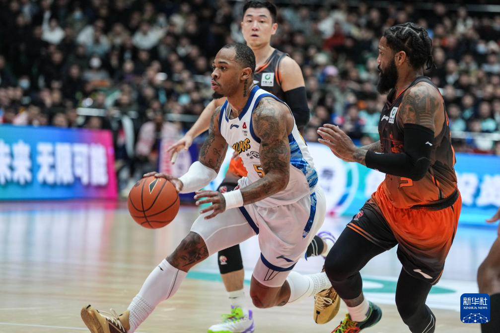 1月25日,山东高速队球员珀塞尔(左)在比赛中突破。
