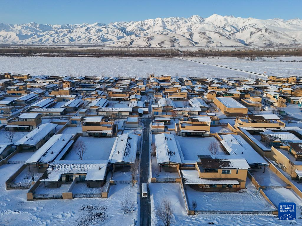 1月24日,摆渡车行驶在新疆那拉提哈茵赛滑雪度假区旁的旅游民俗村(无人机照片)。