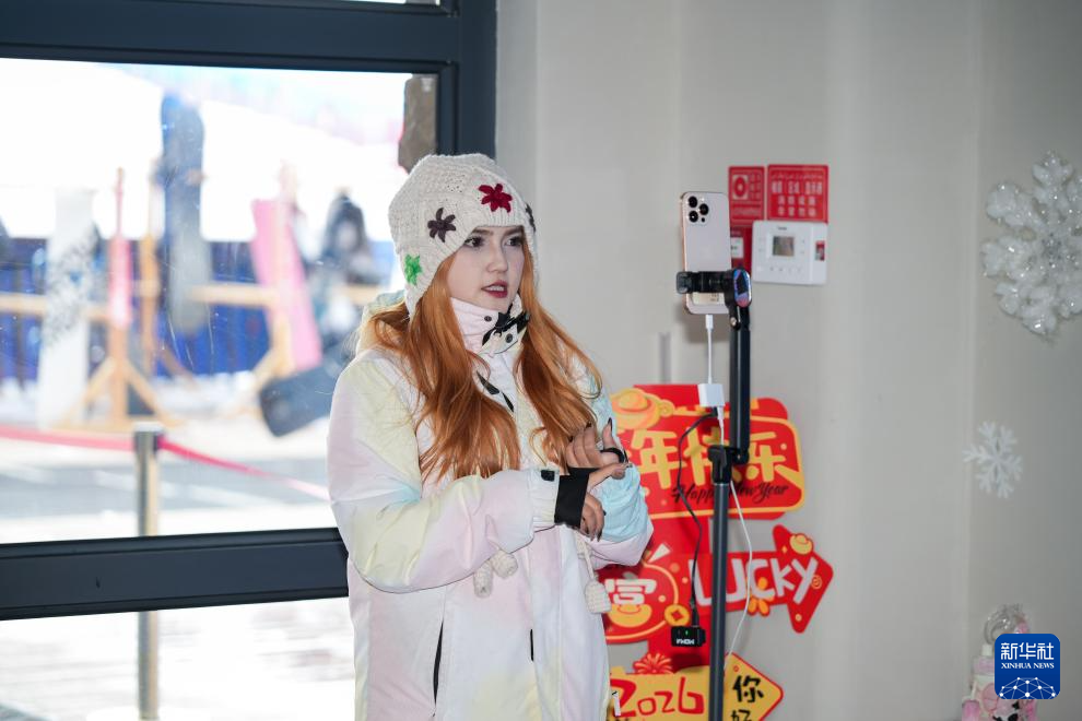 1月25日,主播在新疆那拉提哈茵赛滑雪度假区直播。