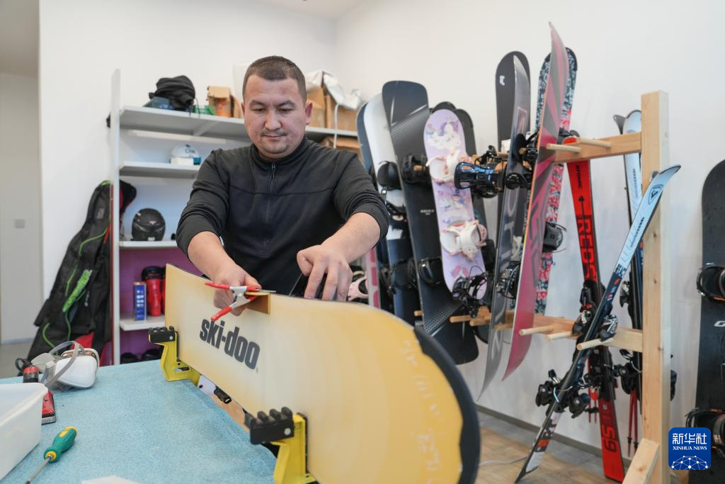 1月24日,新疆那拉提哈茵赛滑雪度假区的工作人员为雪友修理雪板。