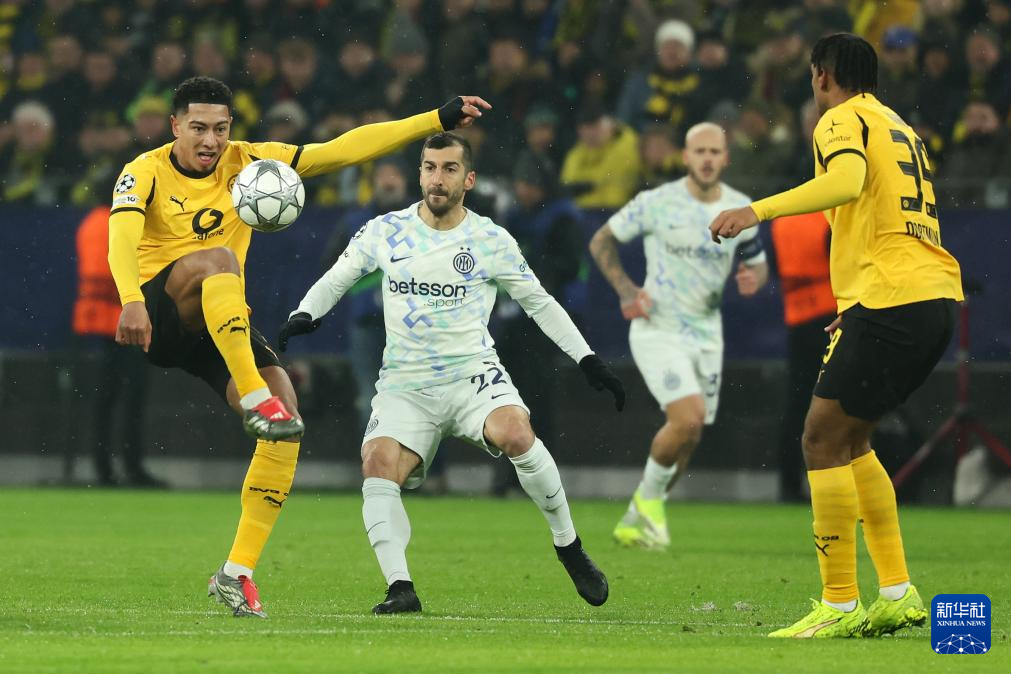 1月28日,多特蒙德队球员乔布·贝林厄姆(左一)和国际米兰队球员姆希塔良(左二)在比赛中拼抢。