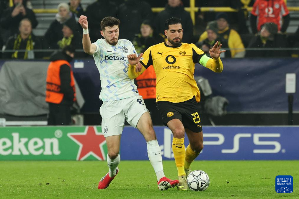1月28日,多特蒙德队球员埃姆雷·詹(右)和国际米兰队球员苏契奇在比赛中拼抢。