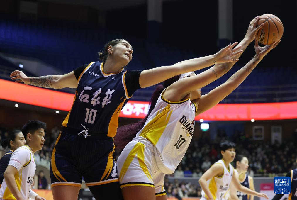 1月30日,石家庄英励队球员艾米莉·波特(前左)与东莞新彤盛队球员卡多佐在比赛中拼抢篮板球。