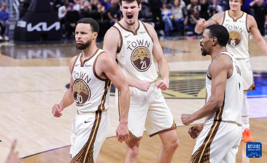 1月30日,勇士队球员库里(左一)在比赛中庆祝。