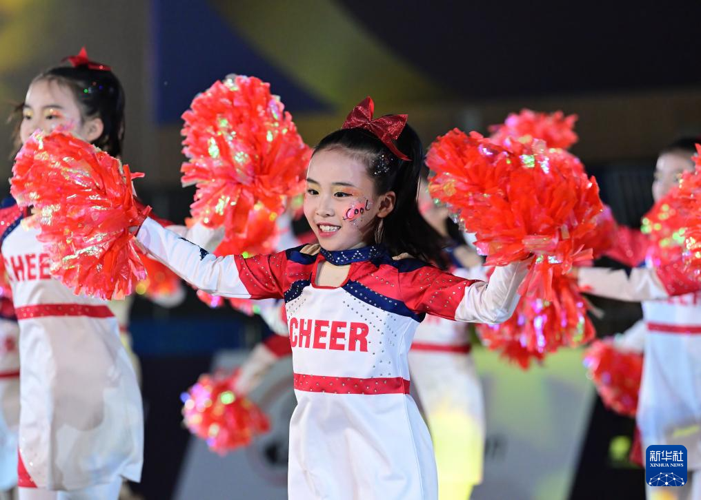 2月1日,小朋友在邀请赛开幕式上进行啦啦队表演。