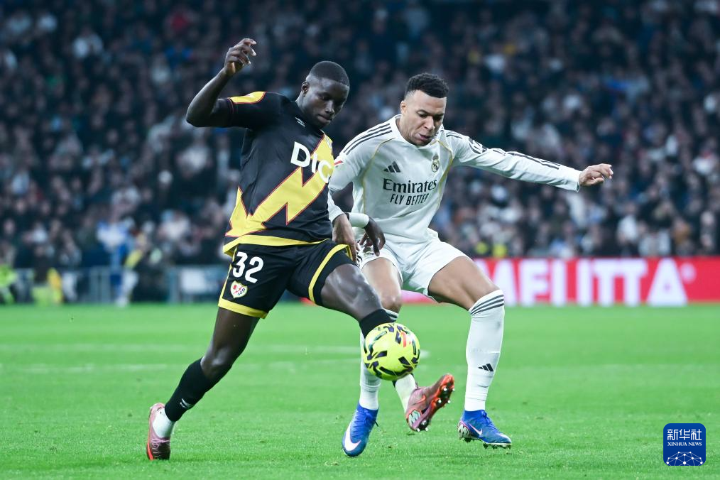 2月1日,皇家马德里队球员姆巴佩(右)和巴列卡诺队球员诺贝尔·门迪争抢。