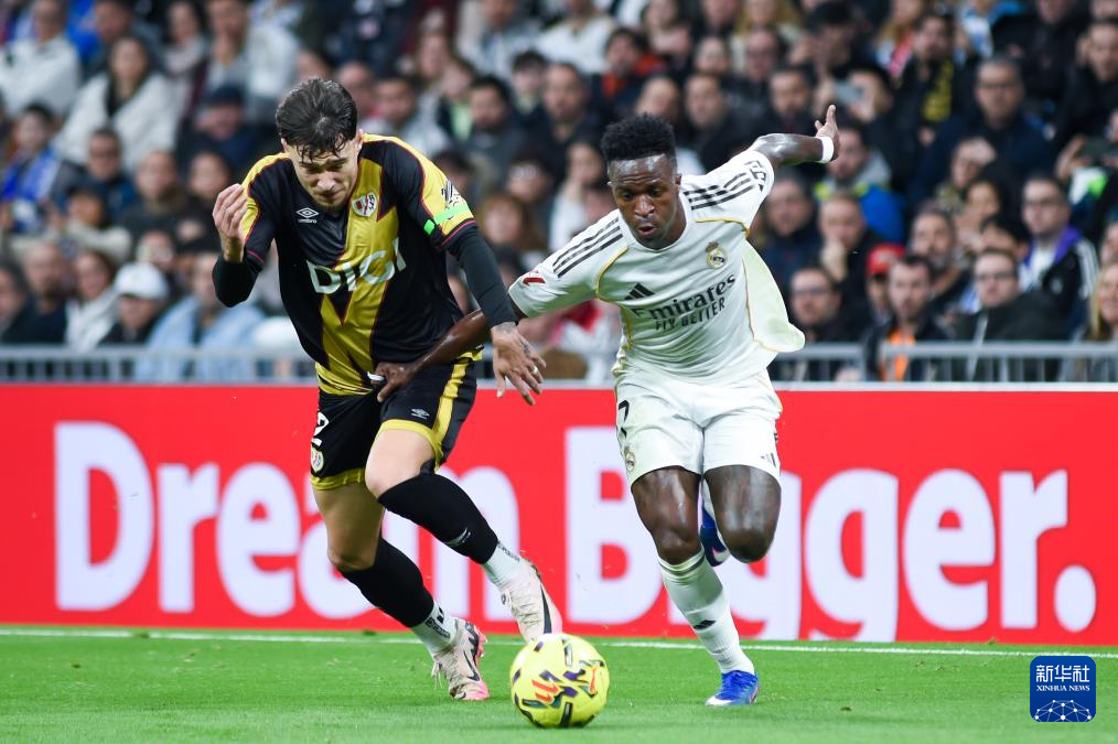 2月1日,皇家马德里队球员维尼修斯(右)和巴列卡诺队球员拉齐乌争抢。