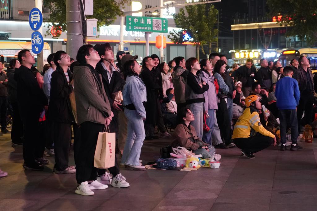 2025年11月1日,在南京金鹰国际购物中心门前广场上,市民在观看“苏超”决赛转播。新华社发(刘臻睿 摄)