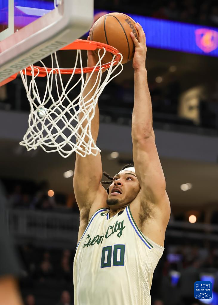 2月3日,雄鹿队球员西姆斯在比赛中扣篮。
