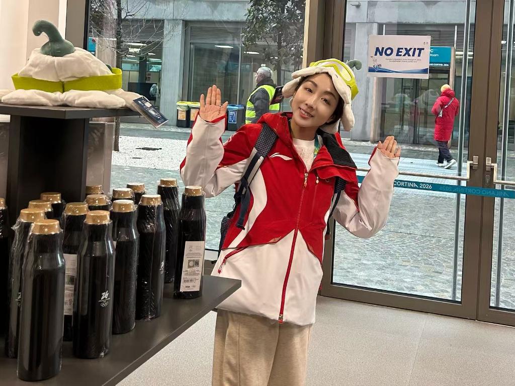 2月3日,在米兰冬奥村,隋文静试戴纪念品帽子。新华社记者 高萌 摄