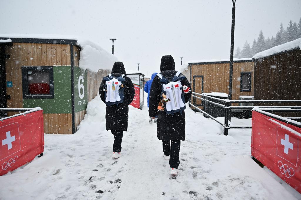2月3日,中国体育代表团成员走在科尔蒂纳冬奥村里。新华社记者 连漪 摄
