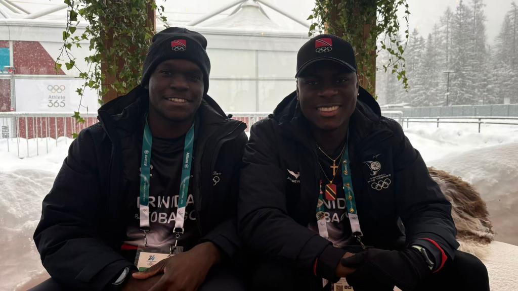 2月3日,沙基尔·约翰(左)与队友德·安德烈·约翰在科尔蒂纳冬奥村接受记者采访。新华社记者 张悦姗 摄
