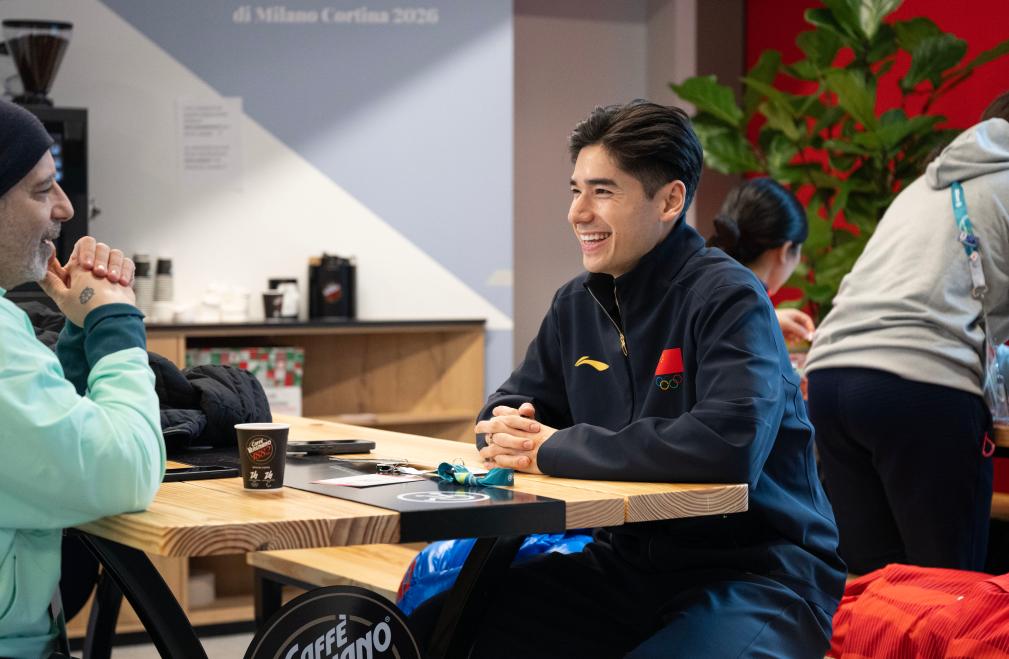2月3日,在米兰冬奥村,中国短道速滑队运动员刘少昂(右)与人交谈。新华社记者 张豪夫 摄